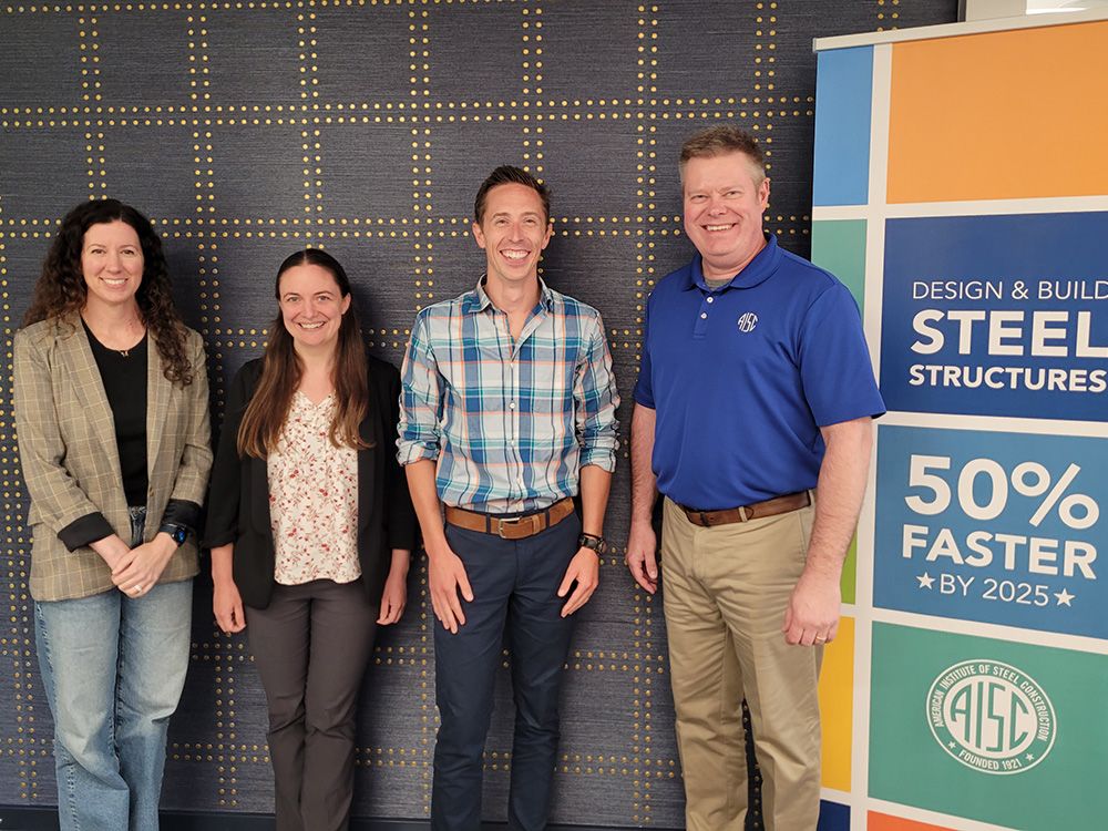 AISC Director of Foundation Programs Maria Mnookin (left) and Vice President of Engineering and Research Chris Raebel (right) are part of the team that hosted AISC's inaugural Innovation Scholars, Ashley Thrall (second from the left) and Joshua Schultz (third from the left), for two weeks of industry engagement and research in the Chicago headquarters.